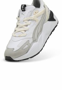 Baskets blanches athlétiques avec des panneaux texturés, présentant des accents gris et crème, un bout rond, un design à lacets, et une semelle en caoutchouc noire.