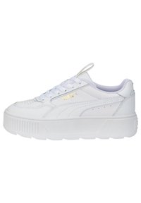 Baskets en cuir blanc avec une semelle blanche épaisse, des lacets plats, un col matelassé et un petit logo doré sur le côté, avec des détails cousus.