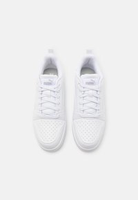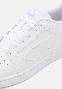 Baskets blanches basses Puma avec fermeture à lacets, zone des orteils perforée et semelle en caoutchouc, vues de côté sur un fond clair.