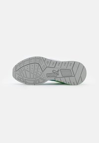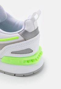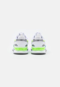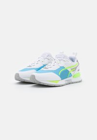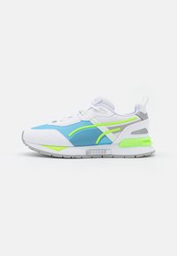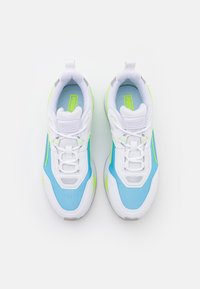 Baskets athlétiques blanches et bleues avec des accents vert néon, semelle grise et languette, sur un fond blanc uni, vue latérale.