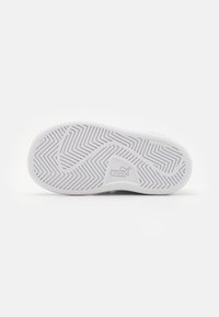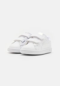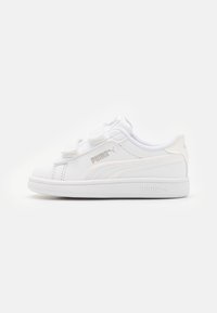 Baskets Puma blanches avec deux sangles Velcro, logo Puma sur le côté et le talon, et semelle en caoutchouc sur un fond blanc uni.