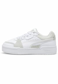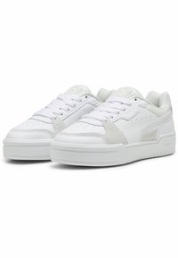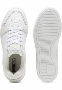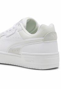 Jambes portant des chaussettes blanches Puma montantes et des baskets blanches Puma basses sur un fond uni gris clair.