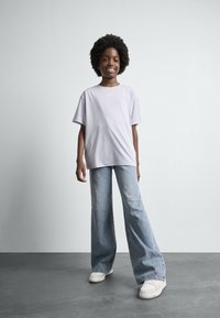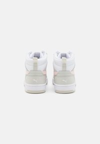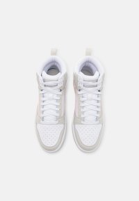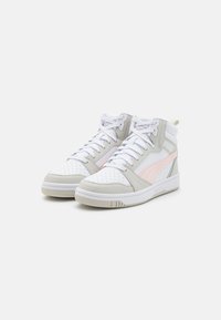 Baskets montantes avec une tige en cuir blanc et des accents gris et rose pâle, des détails texturés et une semelle en caoutchouc blanche.