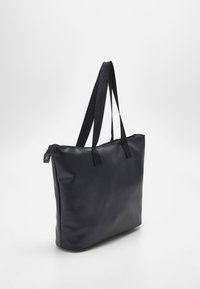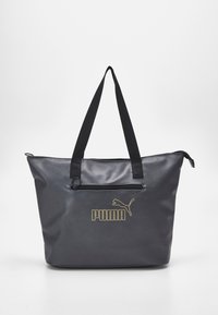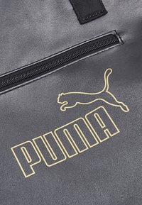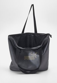 Sac fourre-tout noir Puma avec logo doré, poche avant zippée et longues bretelles d'épaule noires sur fond blanc.