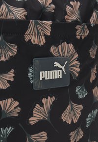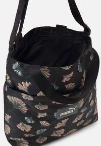 Sac fourre-tout Puma noir avec un motif floral beige et vert et deux poignées noires sur fond blanc.