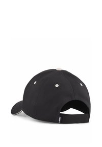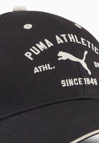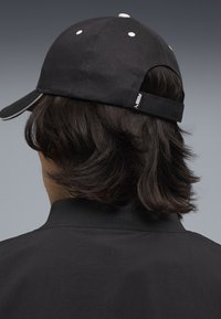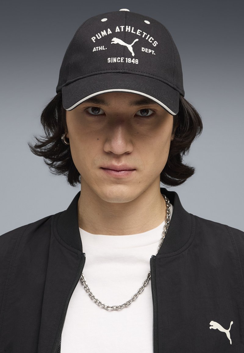 Jeune personne portant une casquette noire Puma, une veste noire avec le logo Puma, un t-shirt blanc et un collier chaîne argenté sur un fond gris.