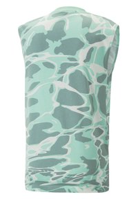 Haut sans manches en teal et vert avec des motifs abstraits et ondulés ; fabriqué en matériau doux. Présente une coupe décontractée et un ourlet arrondi.