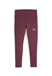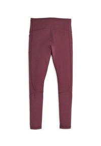 Leggings de sport bordeaux au design épuré, avec des détails de couture et une poche latérale, associés à un haut assorti.