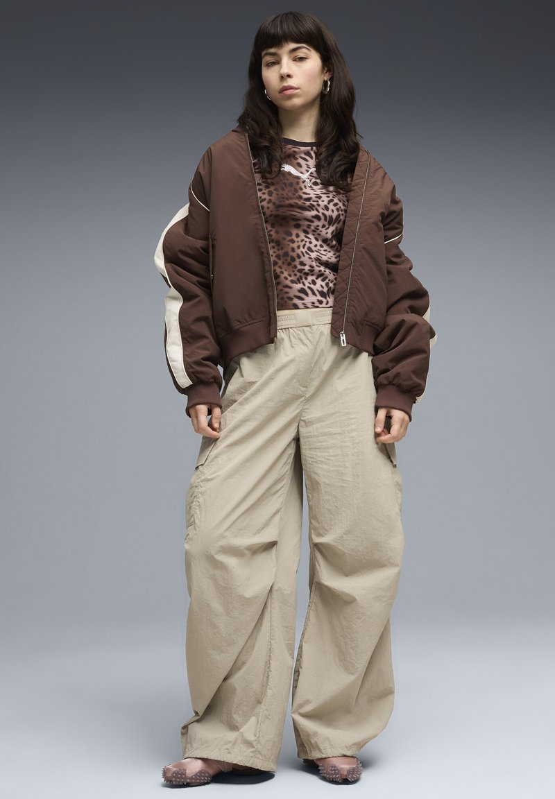 Femme portant une veste bomber marron sur un haut imprimé léopard, un pantalon beige à jambes larges, et des chaussures roses à pointes, sur un fond gris.