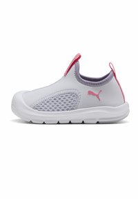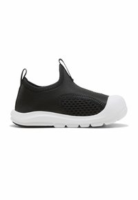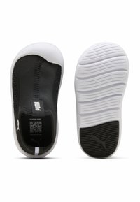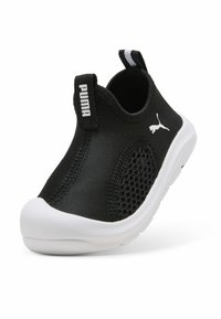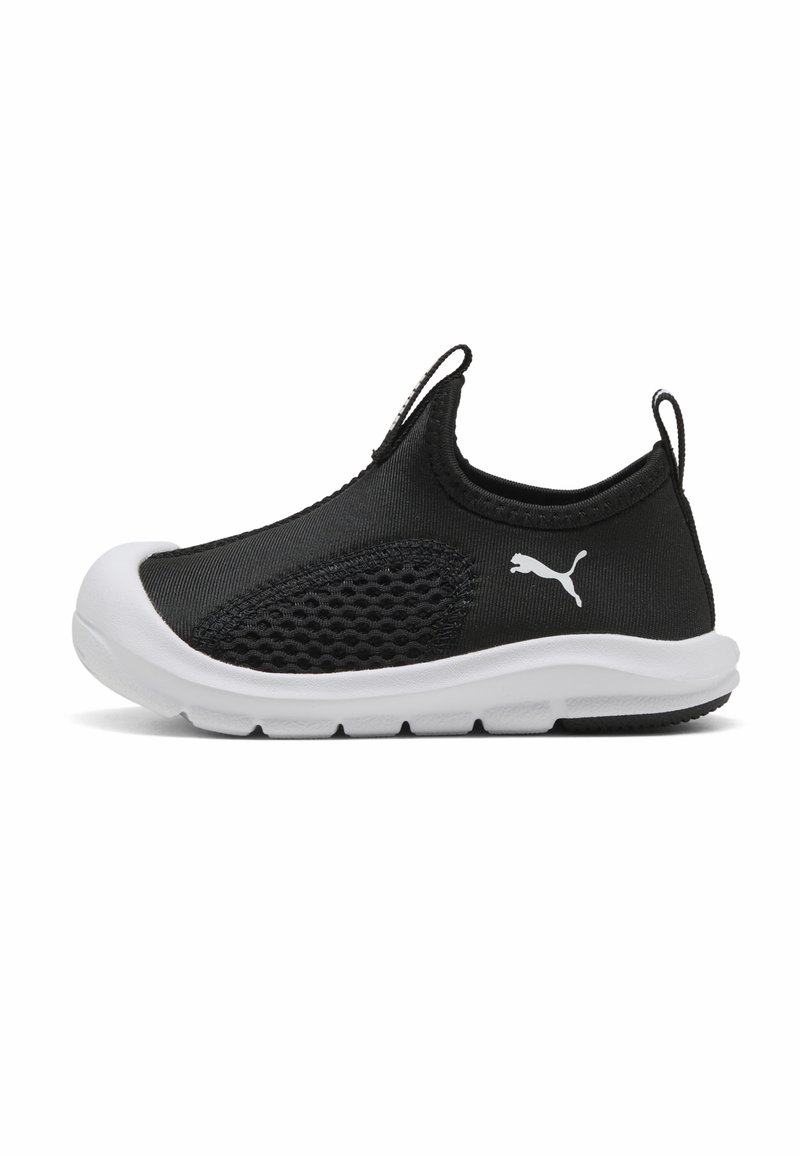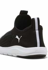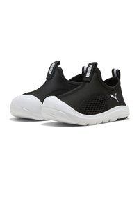 Baskets noires à enfiler avec semelle blanche, panneau en maille sur le côté, languettes au talon et à la langue, et logo Puma sur le côté extérieur.