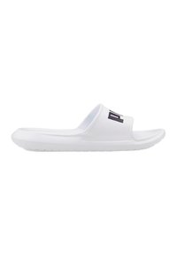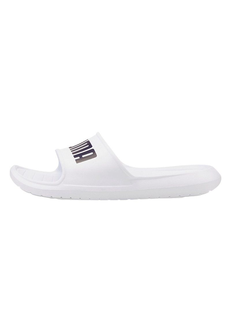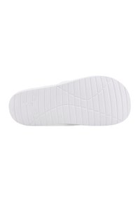 Sandale blanche à glissière avec un dessus lisse et un bout ouvert. Présente un logo noir proéminent et une semelle texturée pour une meilleure adhérence. Fabriquée en matériau léger.