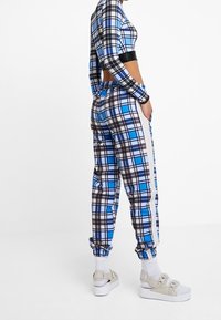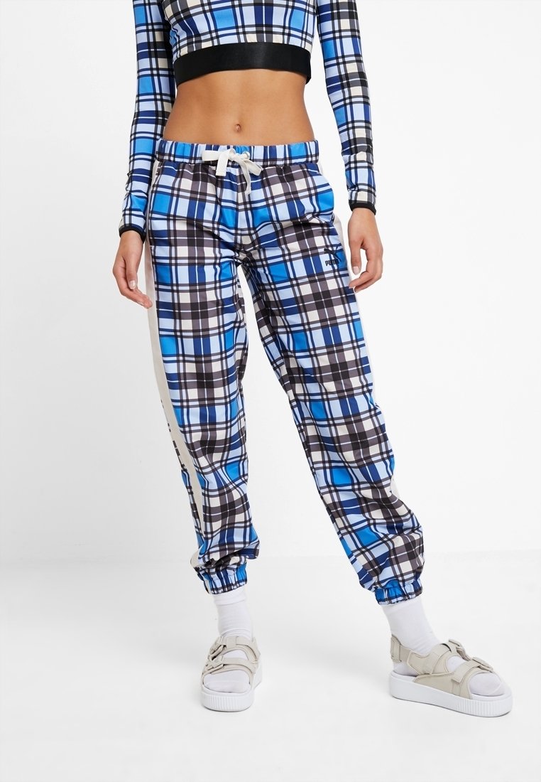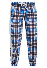 Jogging en plaid bleu et noir avec une taille élastique et un cordon de serrage. Doté de poignets tapered et d'une bande latérale. Le matériau semble lisse.