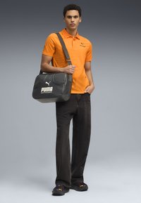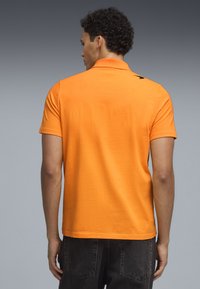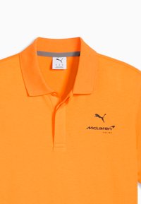 Jeune homme portant un polo McLaren Racing orange vif avec un jean noir, debout les mains dans les poches devant un fond gris dégradé.
