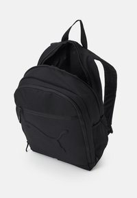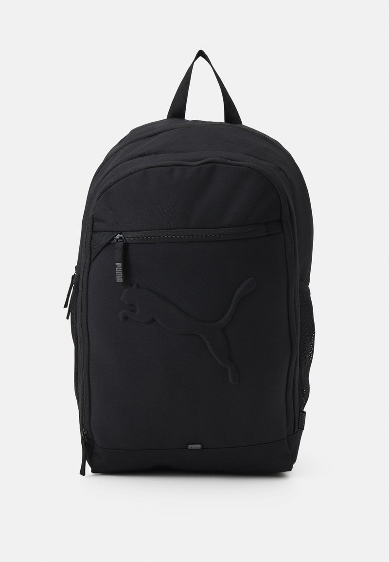 Sac à dos noir en tissu texturé au design élégant, avec un logo Puma en relief, une poche zippée à l'avant et des poches latérales en mesh.