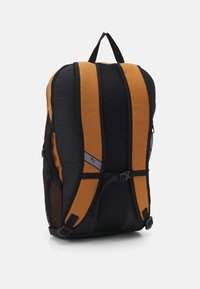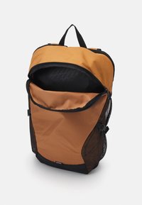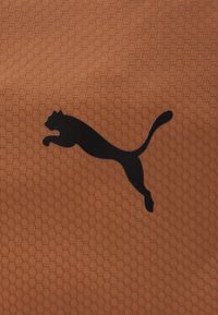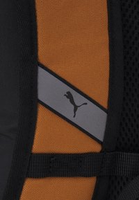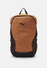 Sac à dos en tissu marron avec des côtés en maille noire, arborant un logo à l'avant, une poignée supérieure et des bretelles ajustables. Compartiment principal zippé.