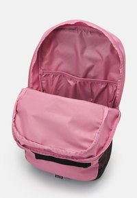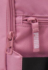 Sac à dos Puma rose avec poche avant zippée, deux sangles noires horizontales, poches latérales en maille et poignée de transport sur le dessus.