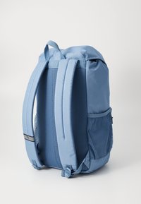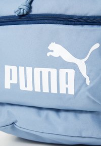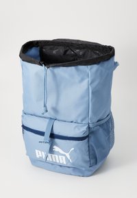 Sac à dos en tissu bleu avec un rabat supérieur, une sangle ajustable, une poche avant zippée, une poche latérale en mesh et un logo Puma blanc sur le devant.