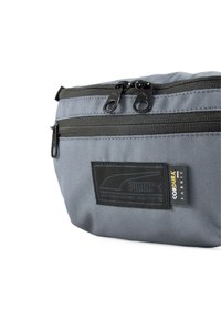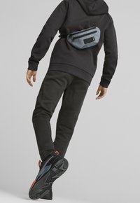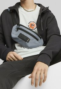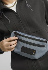 Main en train d'ajuster la fermeture éclair d'un sac banane Puma bleu clair, porté sur une veste zippée noire avec le logo Puma et un collier en chaîne dorée.