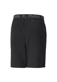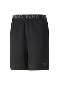 Shorts de sport noirs en tissu doux, dotés d'une fente sur le côté pour plus de mobilité et d'un logo Puma réfléchissant sur le bas de la jambe.