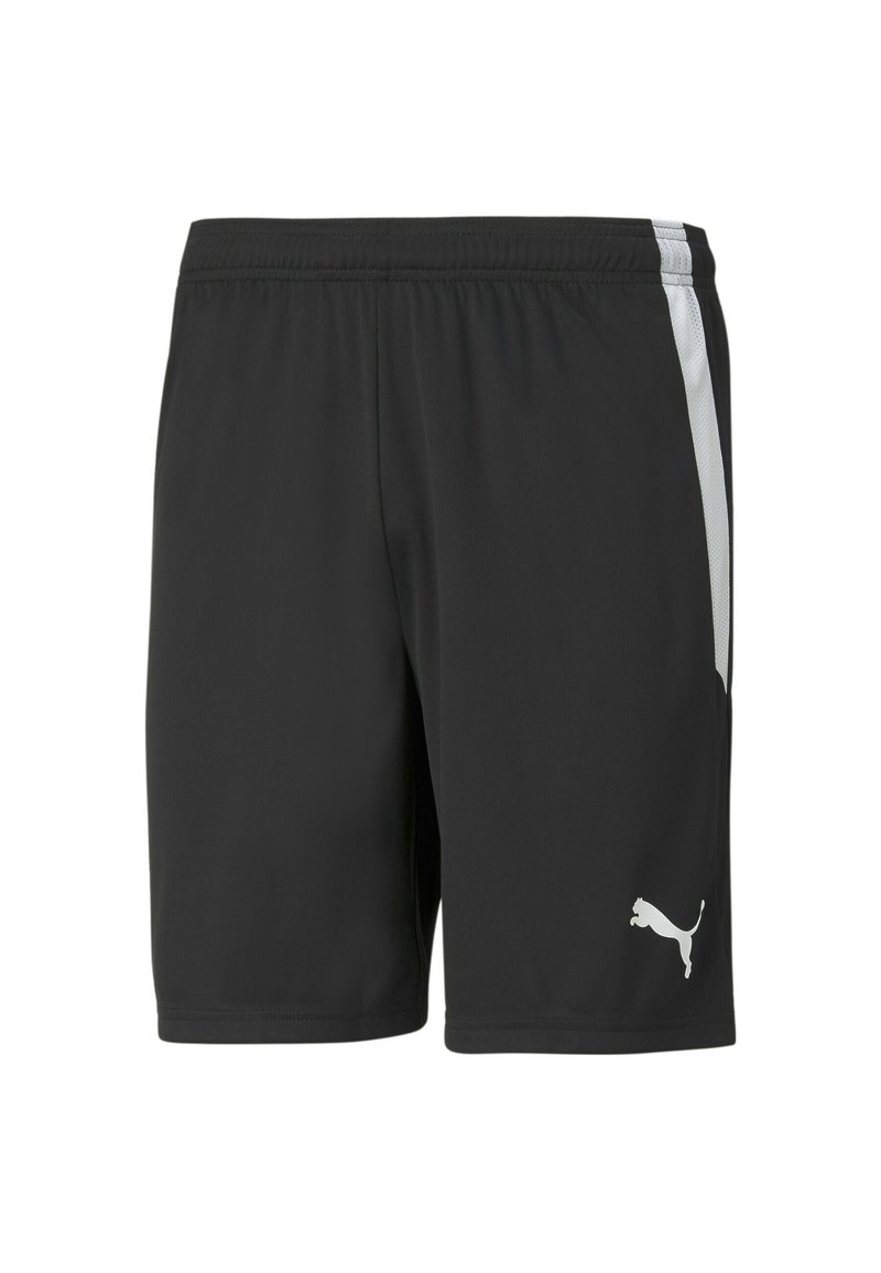 Shorts de sport noirs en tissu léger, avec des bandes blanches sur les côtés et un petit logo Puma blanc en bas à gauche. Taille élastique.