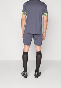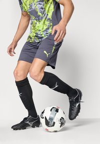 Shorts de sport gris avec un motif abstrait coloré, associés à des chaussettes de compression noires avec des logos blancs et des crampons noirs.