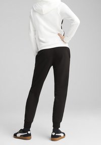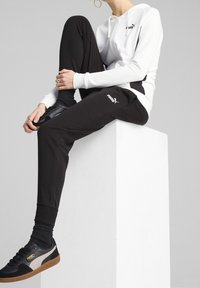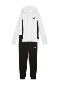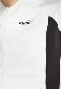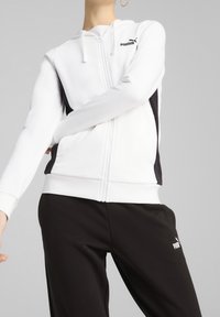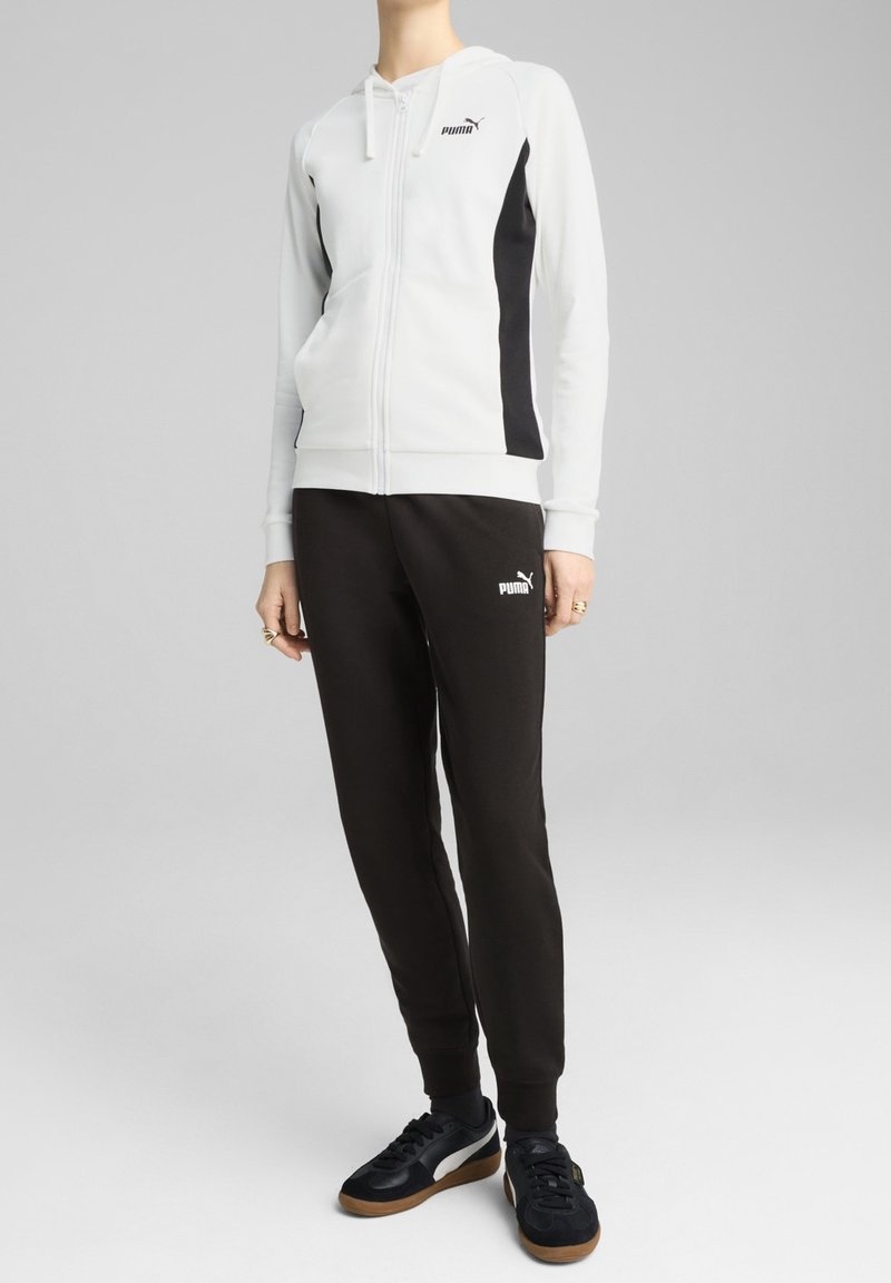 Personne portant un sweat à capuche blanc zippé avec des panneaux latéraux noirs, un pantalon de survêtement Puma noir et des baskets noires avec des semelles en gomme.