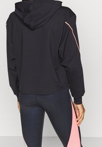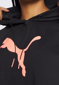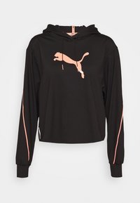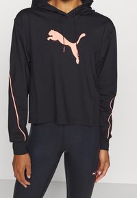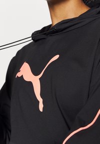 Hoodie noir court avec un logo Puma rose, doté de manches longues avec des accents roses le long des coutures et une capuche avec cordon de serrage.