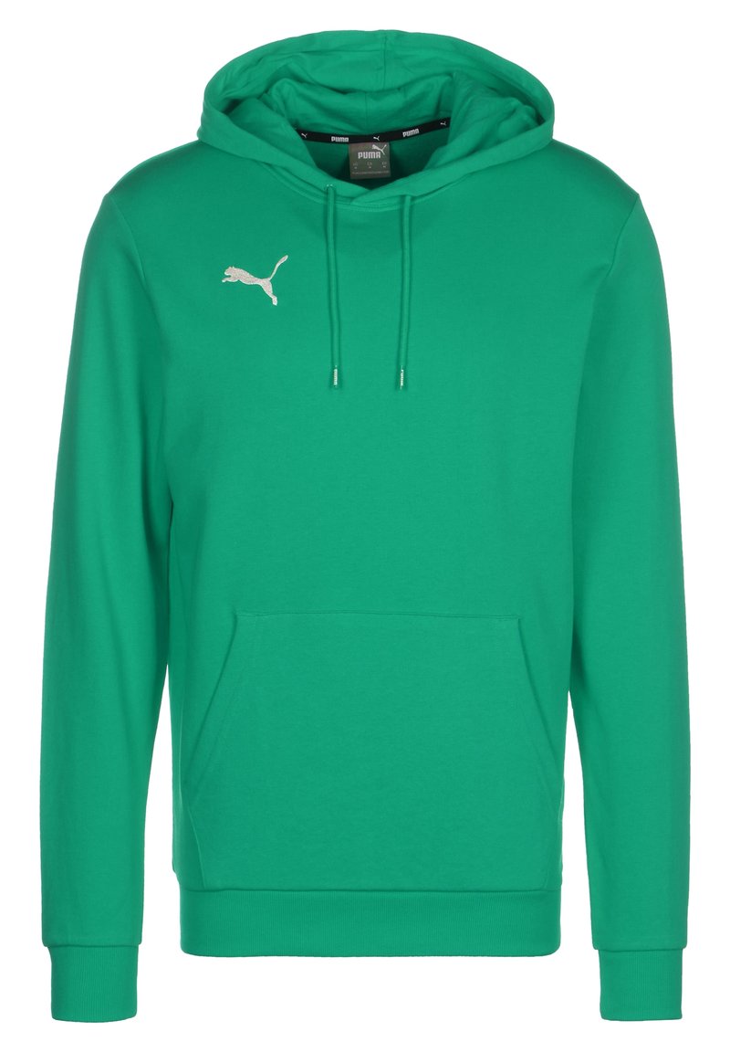 Sweat à capuche vert en coton avec une poche kangourou, une capuche réglable à cordon de serrage et un petit logo Puma blanc sur le côté gauche de la poitrine. Texture douce.