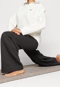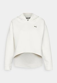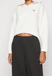Sweat à capuche blanc court avec un motif texturé, capuche à cordon et accent de logo noir. Associé à un pantalon taille haute noir texturé.