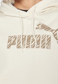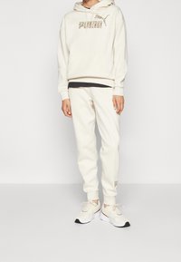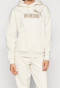 Personne portant un sweat à capuche blanc cassé et un pantalon assorti, avec un logo Puma beige et des cordons de serrage sur le sweat à capuche.