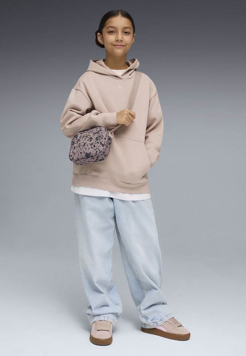 Jeune fille portant un sweat à capuche beige, un jean bleu clair ample, des baskets beige, et portant un sac bandoulière rose à pois noirs.