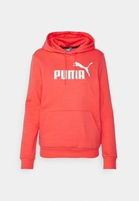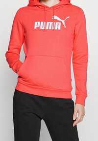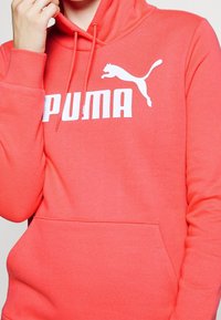 Sweat à capuche corail avec poche kangourou, capuche à cordon de serrage et logo "PUMA" blanc. Tissu doux avec poignets et ourlet côtelés. Porté avec un pantalon noir.