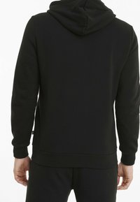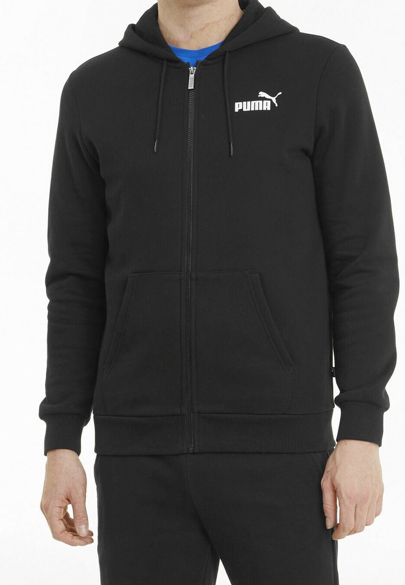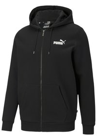 Sweat à capuche noir zippé avec poches kangourou, poignets et ourlet côtelés. Présente un logo Puma blanc sur la poitrine. Tissu doux et texturé.