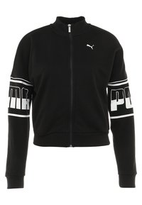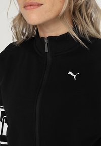 Femme portant une veste zippée Puma noire, un soutien-gorge de sport noir avec logo Puma doré, et des leggings noirs-gris à motif floral.