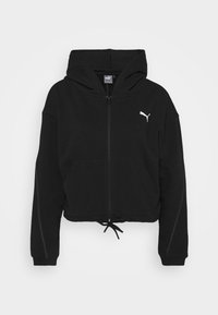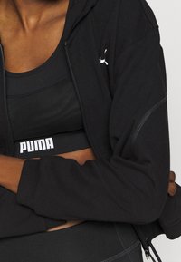 Sweat à capuche noir zippé avec cordons et logo Puma, porté avec un legging noir avec des panneaux en mesh et le texte blanc Puma sur la cuisse.