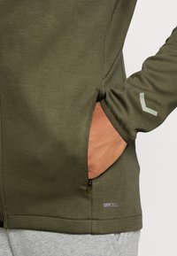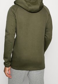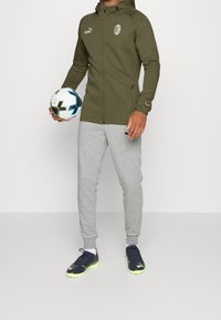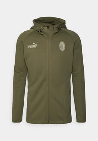Homme portant un sweat à capuche zippé vert olive de l'AC Milan avec le logo Puma et un pantalon de survêtement gris avec le logo Puma, debout devant un fond uni.
