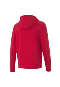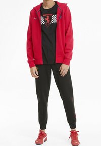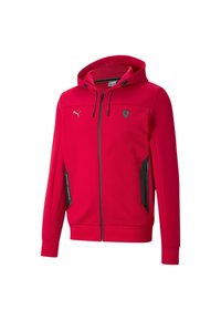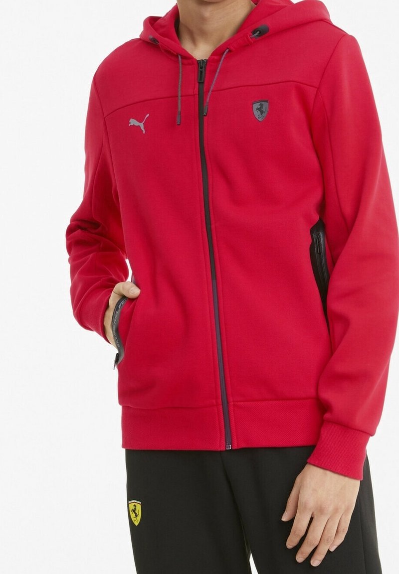 Haut à capuche zippé rouge en tissu doux, présentant un logo Puma sur la poitrine, un emblème Ferrari, une capuche avec cordons de serrage et des poches latérales.