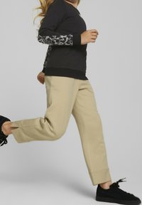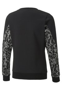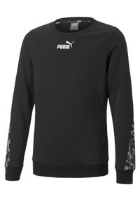 Sweatshirt noir à manches longues en tissu doux, arborant un logo Puma blanc sur la poitrine et des poignets et un ourlet côtelés.
