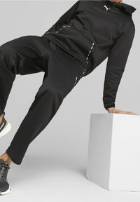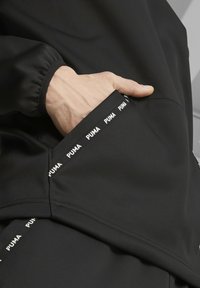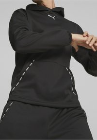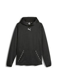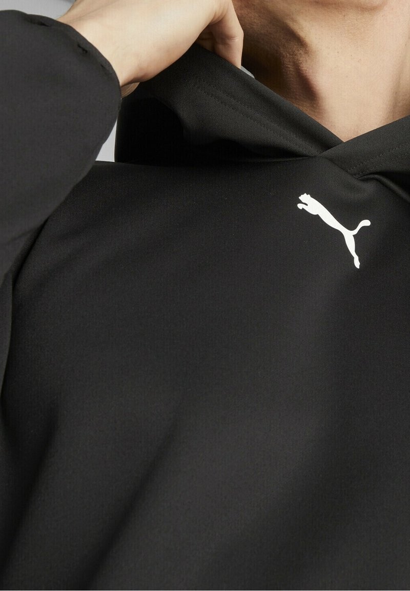 Sweat à capuche noir à texture lisse, présentant un logo Puma blanc sur la poitrine et une capuche avec cordon de serrage. Le tissu semble léger et souple.