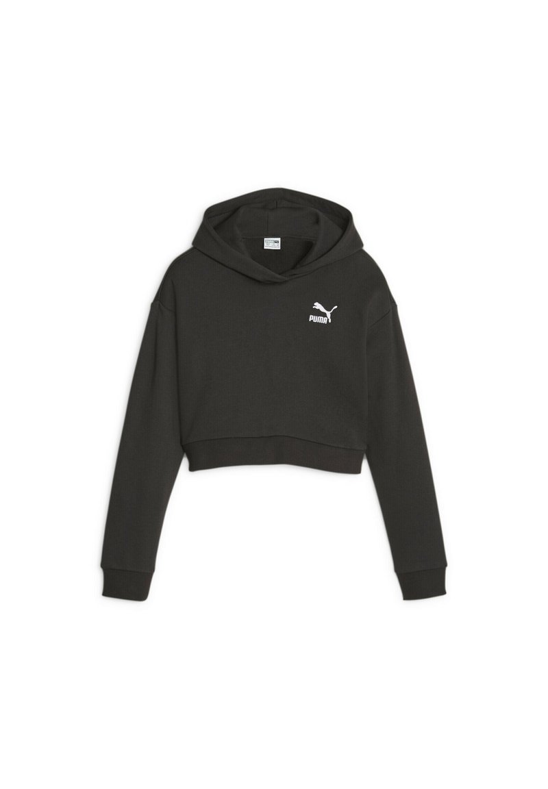 Sweat à capuche court noir à manches longues avec le logo Puma sur le côté gauche de la poitrine sur un fond blanc.