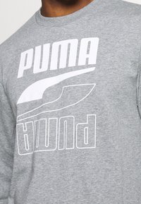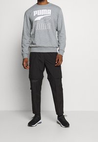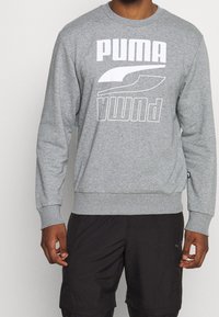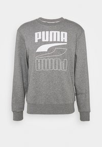 Homme portant un sweat-shirt gris à manches longues avec un logo PUMA blanc audacieux imprimé deux fois, une fois inversé, associé à un short noir.