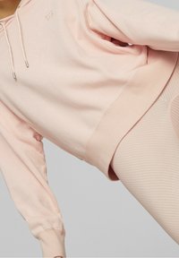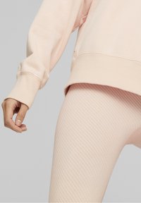 Gros plan sur une personne portant des leggings côtelés beige clair et un haut à manches longues assorti avec des poignets côtelés, sur un fond gris uni.