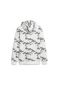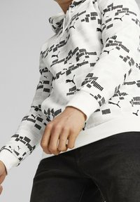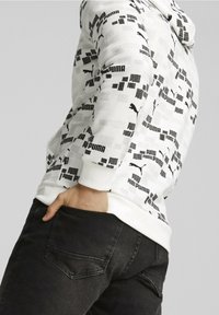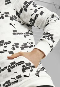 Homme assis sur un bloc blanc, portant un sweat à capuche blanc Puma avec logos noirs, un short noir et des baskets Puma noires avec semelles blanches.