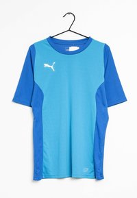 T-shirt de sport bleu avec manches courtes, encolure ronde et panneau latéral en bleu foncé contrastant. Logo Puma blanc sur la poitrine.