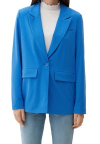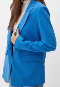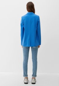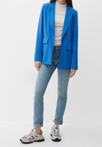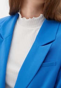 Femme portant un blazer bleu vif sur un top blanc côtelé et un jean bleu clair, debout devant un fond uni.