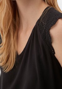 Haut noir sans manches avec détails en dentelle festonnée sur les épaules, tissu doux, design à col en V, associé à un jean gris. Coupe simple et moderne.