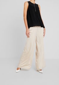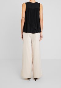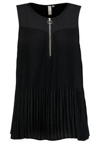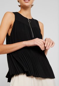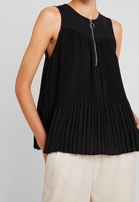 Haut noir sans manches plissé avec une fermeture éclair argentée à l'avant et un tirette rond, porté avec un pantalon beige clair, mains dans les poches.