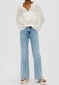 Blouse blanche à manches longues en œillet avec un col lacé associée à un jean taille haute bleu clair, portée par une personne à la peau de ton moyen.