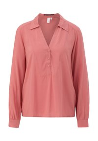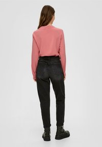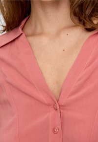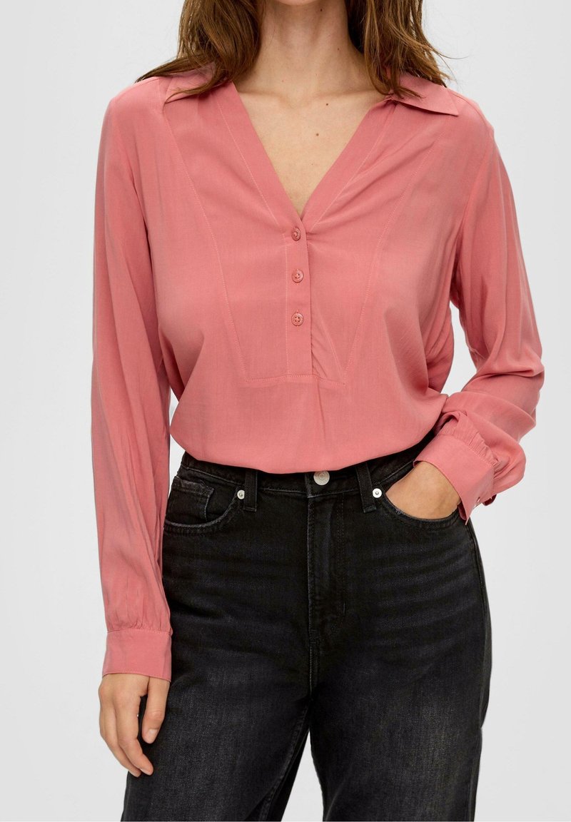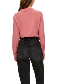 Femme portant un chemisier rose poussiéreux à manches longues avec col en V et boutons, et un jean noir taille haute, main posée dans la poche.