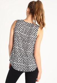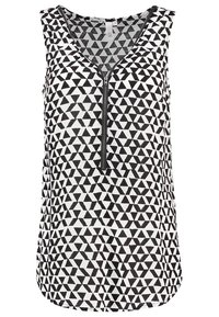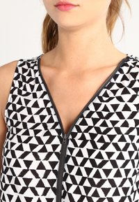 Haut sans manches à motifs géométriques noir et blanc avec une fermeture éclair à l'avant, porté par une personne ajustant l'ourlet d'une main.